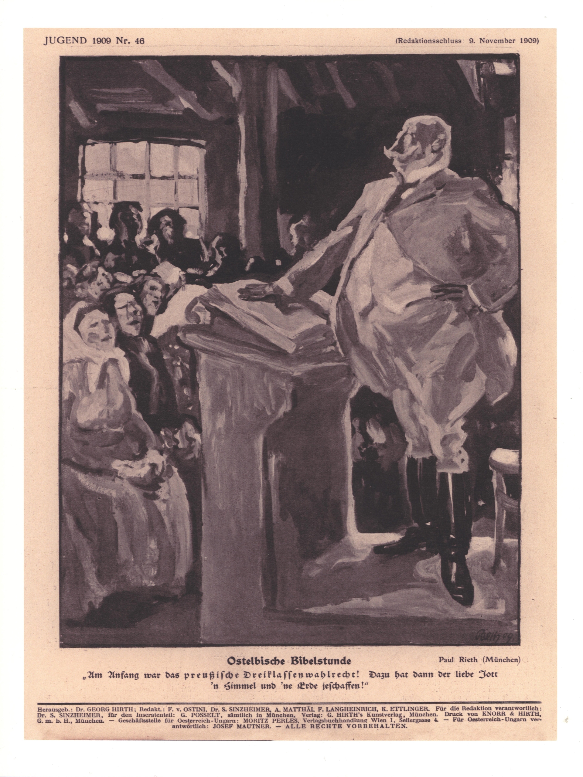 „Ostelbische Bibelstunde. Am Anfang war das preußische Dreiklassenwahlrecht! Dazu hat dann der liebe Jott ‘n Himmel und ‘ne Erde jeschaffen!“, Karikatur von Paul Rieth (1871 – 1925), aus „Jugend“ Nr. 46, München, 1909