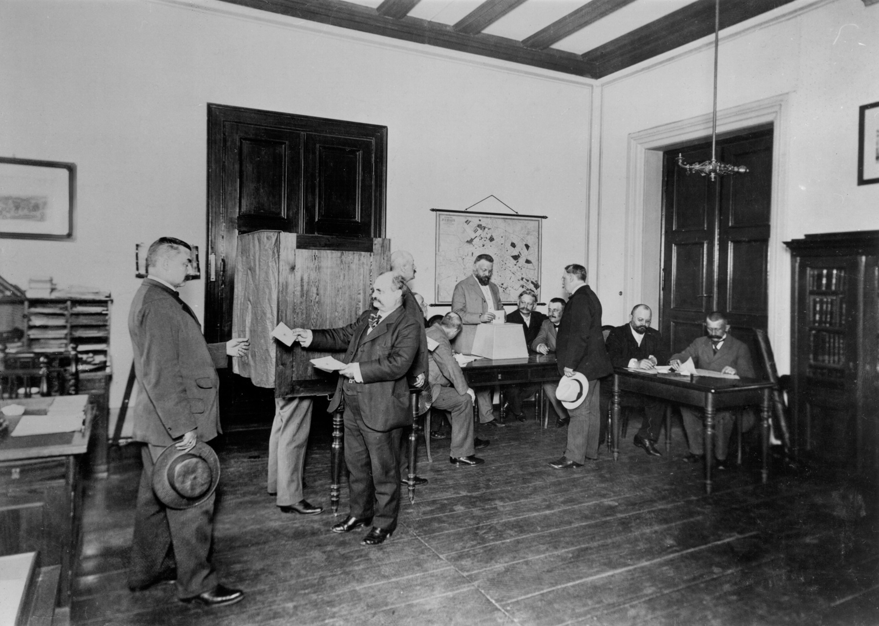 Wahllokal in Berlin Reichstagswahl 1903 – Fotografie, Deutschland, 1903 – Das Foto zeigt Wähler beim Wahlvorgang. Die Wahlvorsteher sorgten für die Weitergabe der ermittelten Wahlresultate an die zuständigen Stellen und verwahrten die versiegelten Wahlunterlagen bis zur Erklärung der Gültigkeit der Wahl durch den Reichstag. Mancher Wahlvorsteher aber überprüfte verbotenerweise Stimmzettel, lehnte die Annahme politisch nicht genehmer Stimmzettel ab, erklärte sie wegen angeblicher Formfehler für ungültig oder verteilte solche seiner eigenen Partei.