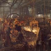 Menzel war seit 1856 Professor der Königlichen Akademie der Künste in Berlin und hatte wiederholt Aufträge des preußischen Königshauses angenommen. Seine Aufmerksamkeit galt allerdings auch politischen und sozialen Themen. 1848 malte er das Gemälde „Aufbahrung der Märzgefallenen“, das als eines der ersten Werke politisch engagierter Malerei in Deutschland gilt. Ebenso wie die Revolution blieb es unvollendet. 1875 schuf er „Das Eisenwalzwerk“, für die Studien hatte er die Königshütte in Oberschlesien besucht. Dieses Bild ist in der Dauerausstellung „Otto von Bismarck und seine Zeit“ im Historischen Bahnhof Friedrichsruh als begehbarer Raum zu erleben.