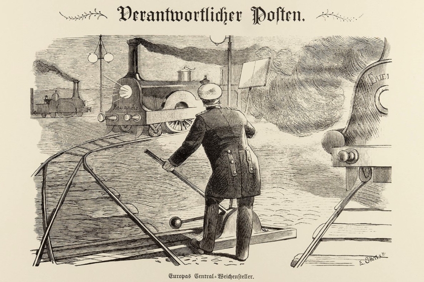 Die Außen- und Bündnispolitik Otto von Bismarcks beschäftigte nicht nur die europäischen Königshäuser und Regierungen, sondern auch die Karikaturisten. Die Zeichnung „Verantwortungsvoller Posten. Europas Central-Weichensteller“ erschien im Oktober 1887 in der Zeitung „Kladderadatsch“. Halb belustigt, halb respektvoll wird gezeigt, wie Bismarck versucht, den Weg Frankreichs hin zu einem Revanchekrieg abzubiegen, und dabei aufpassen muss, andere Mächte nicht aus dem Blick zu verlieren.