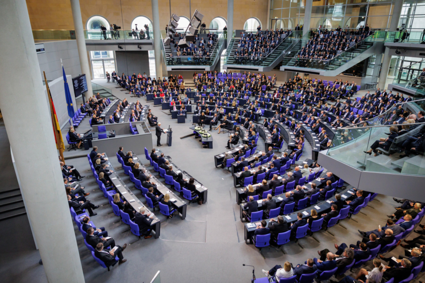 Foto: Gedenkstunde zum 80. Jahrestag des Endes des Zweiten Weltkrieges am 8. Mai 2025: Übersicht des Plenarsaals während der Gedenkrede von Bundespräsident Dr. Frank-Walter Steinmeier. Foto: Thomas Köhler / photothek